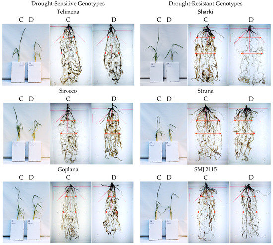 Representative examples of 8-week-old wheat plants and their roots in control (C) and drought (D) conditions during the root-box experiment. Cvs. “Telimena”, “Sirocco”, and “Goplana” were selected as drought-sensitive genotypes, while cvs. “Sharki”, “Struna”, and “SMJ 2115” as drought-resistant genotypes. The angle of 45° from main root axis is marked in red, and arrows indicate the width of the root system.