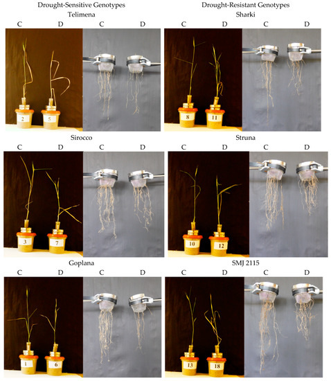 Representative examples of 8-week-old wheat plants and their roots in control (C) and drought (D) conditions during the root-basket experiment. Cvs. “Telimena”, “Sirocco”, and “Goplana” were selected as drought-sensitive genotypes, while cvs. “Sharki”, “Struna”, and “SMJ 2115” as drought-resistant genotypes.