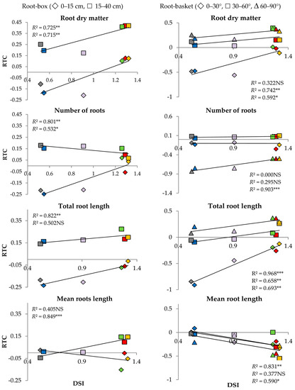 Linear correlation coefficients “r” between DSI ([26] and Materials and Methods section) and RTC of the measured traits in the plants growing in root-box and root-basket containers were high and statistically significant (Table 5). Contrary to that, insignificant correlation coefficients “r” were calculated for the length of seminal and seminal adventitious roots (0.605 and 0.104) and the number of roots growing at the angle of 0–30° and 30–60° (−0.004 and 0.543).