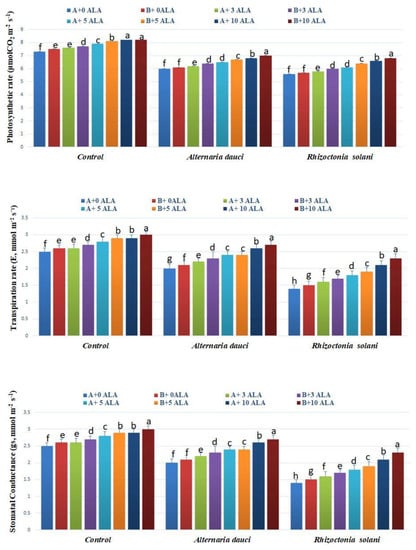 Mean values of rosemary photosynthetic rate (Pn, μmol CO2 m−2 s−1), transpiration rate (E, mmol m−2 s−1), and stomatal conductance (gs, mmol m−2 s−1), as affected by ALA treatment (3, 5, and 10 ppm) and Alternaria dauci and Rhizoctonia solani inoculations in different soils (A and B). Different letters within treatment indicate significant differences.