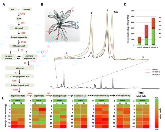Wounding-induced changes in the accumulation of secoiridoid glucosides in C. erythraea. (A) The proposed biosynthetic pathway of secoiridoid glucosides (SGs) in C. erythraea (modified from []). Arrow with a solid line indicates the known enzyme, arrow with dashed line designates unknown enzyme. (B) Visualization of the wounding procedure within the experimental set-up: wounded (local leaves–LL) and non-wounded leaves (systemic leaves—SL). (C) UHPLC/DAD chromatogram of non-wounded leaves at the beginning of experiment; extracted is the enlarged part of the chromatogram where iridoids and secoiridoids elute. (D) Total iridoids content in control leaves and upon 96 h after wounding (HAW), 1—loganic acid, 2—loganin, 3—secologanin, 4—sweroside, 5—swertiamarin, 6—gentiopicrin. (E) Heat maps based on the scaled values presenting the relationships between LL and SL of C. erythraea at determined time points (h) after wounding (HAW). Scaling was performed for each compound independently. The values are represented by the variation from green (min concentration) to red color (max concentration), as indicated on the color scale. For the interpretation of the references to color in this figure legend, the reader is referred to the web version of this article. Abbreviations: GPPS—geranyl diphosphate synthase, GES—geraniol synthase, G8O—geraniol-8-oxidase, 8HGO-8-hydrohygeraniol oxidoreductase, IS—iridoid synthase, IO—iridoid oxidase, 7DLGT—7-deoxyloganetic acid glucosyltransferase, 7DLH—7-deoxyloganic acid hydrolase, LAMT—loganic acid O-methyltransferase and, SLS—secologanin synthase.