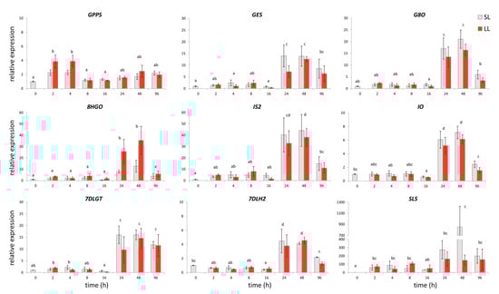 Gene expression of secoiridoid glucosides (SGs) metabolic pathway genes in C. erythraea leaves at determined time points (h) after wounding (HAW). The relative expressions of the genes were normalized against CeEF1 gene as an internal control; non-wounded leaves at 0 HAW were set as a calibrator. Since factorial ANOVA revealed that type of leaves does not significantly contribute to the gene expression, only the effect of time was post hoc tested. In all cases, bars with different letters are significantly different (p < 0.05) according to post hoc Tukey’s test. Abbreviations: GPPS–geranyl diphosphate synthase, GES—geraniol synthase, G8O—geraniol-8-oxidase, 8HGO—8-hydrohygeraniol oxidoreductase, IS2—iridoid synthase, IO—iridoid oxidase, 7DLGT—7-deoxyloganetic acid glucosyltransferase, 7DLH2—7-deoxyloganic acid hydrolase, SLS—secologanin synthase, EF1—elongation factor 1, LL—local leaves, and SL—systemic leaves.