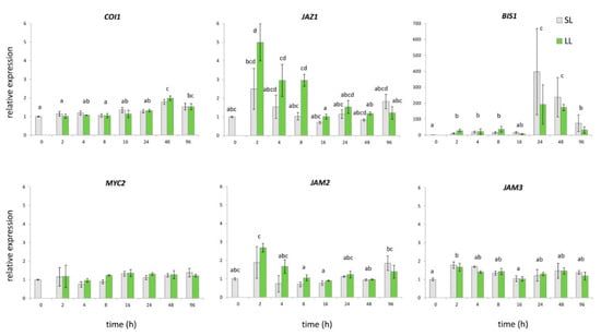 Relative gene expression patterns of selected transcription factors in C. erythraea leaves at determined time points (h) after wounding (HAW). The relative expressions of the genes were normalized against CeEF1 gene as an internal control; unwounded leaves at 0 HAW were set as a calibrator. Since factorial ANOVA revealed that leaf type does not significantly contribute to the expression of CeCOI1, CeBIS1, CeJAM2, and CeJAM3 transcription factors, only the effect of time was post hoc tested. In these cases, bars with different letters are significantly different (p < 0.05) according to post hoc Tukey’s test. Leaf type (SL or LL) was the factor that significantly contributed to gene expression of CeMYC2. Factorial ANOVA indicated that time, leaf type, and interaction time x condition significantly contribute to the CeJAZ1 gene expression. In this case each bar with different letters is significantly different (p < 0.05) according to post hoc Tukey’s test. Abbreviations: LL—local leaves, SL—systemic leaves.