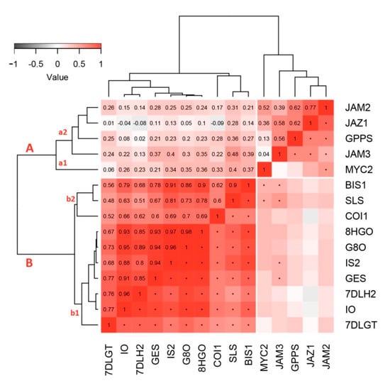 Heatmap of pairwise Pearson correlations based on the relative gene expression of SGs biosynthetic genes and transcription factors. Correlation coefficients are shown in the upper triangle, while statistical significance (p < 0.01) is marked with an asterisk at the appropriate positions in the lower triangle. The correlogram is ordered based on hierarchical cluster analysis performed on a distance matrix (1-correlation matrix: minimal distance for absolutely positively correlated and maximal distance for absolutely negatively correlated gene expression). The dendrograms are shown on heatmap sides. All caps represent clusters, while small letters represent sub-clusters. Abbreviations: GPPS—geranyl diphosphate synthase, GES—geraniol synthase, G8O—geraniol-8-oxidase, 8HGO—8-hydrohygeraniol oxidoreductase, IS—iridoid synthase, IO—iridoid oxidase, 7DLGT—7-deoxyloganetic acid glucosyltransferase, 7DLH—7-deoxyloganic acid hydrolase, LAMT—loganic acid O-methyltransferase, SLS—secologanin synthase.