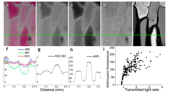 Quantifying vacuolar anthocyanin. Images were recorded sequentially in line-by-line mode using four-fold averaging. A false colour transmitted light image (a) was created using (b) blue (488 nm), (c) green (561 nm) and (d) red (633 nm) light images, with these collected at the same time as high-intensity 561 nm green excitation to excite anthocyanin (e). Intensity profiles were generated along the green line with ImageJ, and plotted for the three different transmitted light wavelengths. The intensity plot for the green image dropped markedly in the red cell, consistent with green light being absorbed, whereas intensity in the red image dropped only slightly. (f) Dividing the red intensity by the green intensity (T633/T561) provided a convenient measure of the anthocyanin present in the cell, in which variations present in both images such as cell walls and organelles were reduced. (g) Anthocyanin fluorescence intensity. (i) Anthocyanin showed a strong but non-linear correlation with the transmitted light ratio (T633/T561). Bar in (a) = 100 µm for (a–e).
