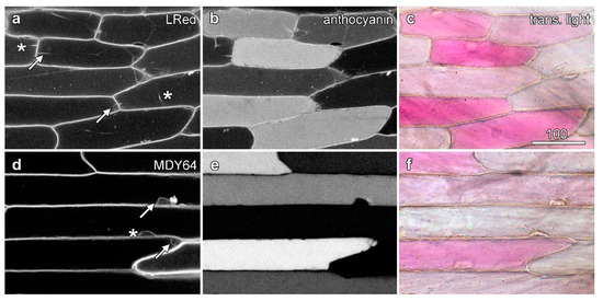 Tonoplast labelling is unaffected by the presence of anthocyanin. Epidermal peels loaded with dyes were imaged with sequential scanning. Images are confocal optical sections of dye fluorescence (left column; a,d), with the tonoplast labelling in anthocyanic cells indicated with arrows and in white cells with asterisks, anthocyanin fluorescence (central column; b,e), and a colour transmitted light image (right column; c,f). (a–c) Lysotracker Red DND-99 (LRed) imaged with green excitation collecting shorter wavelength red fluorescence, with the longer wavelength red fluorescence collected from anthocyanin with some bleed-through of the Lysotracker. (d–f) MDY-64 imaged with blue (473 nm) excitation. Bar in (a) = 100 µm for all images.