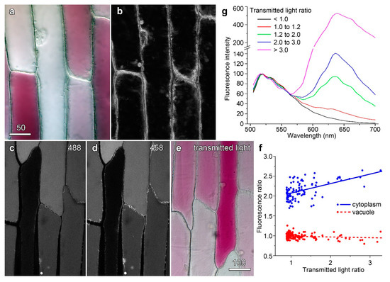 Cytoplasmic streaming is often taken as an indicator of plant cell health [30]. Following colour transmitted light imaging to establish variations in anthocyanin (Figure 4a), cytoplasmic streaming was observed using red light. An image showing the difference between each image and an average projection (Figure 4b) gave no indication that anthocyanic cells were any less active than their less red neighbours. Vacuolar and cytoplasmic pH have also been investigated to determine whether redder cells have altered pH homeostasis. Anthocyanins are natural pH indicators, changing from red at acidic pHs through blue to green at less acidic and neutral pHs, with these colour changes known to reflect vacuolar pH [31]. It has previously been shown that onion epidermal cells showing a wide range of anthocyanin levels have constant ratios of absorbance for red, green, and blue light [30]. This consistency in ratio indicates the cells are the same colour and, thus, that the vacuoles have the same pH irrespective of anthocyanin level. Moreover, changing vacuolar pH with the weak base methylamine [32,33], making the vacuole less acidic, caused change to absorbance ratios [30].