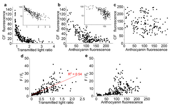 The correlations between carboxyfluorescein fluorescence and anthocyanin was investigated with Stern–Volmer plots, often used to characterise fluorescence quenching in vitro [34], and in which the fluorescence from a fluorescent species in the absence of quencher, divided by the molecule’s fluorescence in the presence of the quencher (F/F0), generate a straight line when plotted against the concentration of the quencher. For these analyses, carboxyfluorescein data were replotted against anthocyanin concentration, taken either as the raw anthocyanin fluorescence (Figure 5e) or a modification of the transmitted light ratio, defined as the ratio minus the minimum transmitted light ratio recorded which was assumed to be equivalent to no anthocyanin (Figure 5d). The expected straight line response was generated, consistent with molecular quenching, when the plots were conducted against anthocyanin measured with the transmitted light ratio (R2 = 0.54) (Figure 5d). However, a non-linear response was present when data were plotted against anthocyanin fluorescence (Figure 5e). This non-linear response would be consistent with reduced fluorescence at high anthocyanin concentrations because of self-shading and absorbance effects, as indicated by the non-linear relationship between the two anthocyanin measurements (Figure 1i). Subsequent analyses were only conducted against the transmitted light ratio.