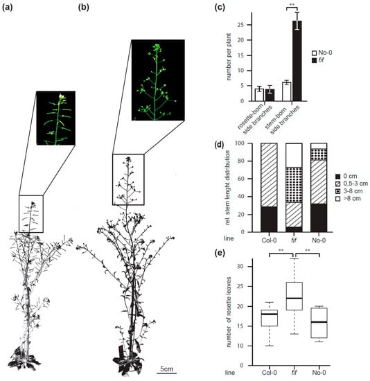 Furthermore, the fif mutant plant displayed an aberrant growth habitus compared to wild type No-0 (Figure 2a,b). The “bushy” appearance of the fif mutant was due to an enhanced number of stem-born side branches compared to wild type No-0, whereas the number of rosette-born side shoots was the same in fif and wild type No-0 plants (Figure 2c). Furthermore, the stem length of the fif mutant plants a month after sowing showed a different size distribution compared to wild type No-0 and Col-0 (Figure 2d). Whereas the majority of the stem length of the No-0 and Col-0 plants was at 0 cm and between 0.5 and 3.0 cm, the fif plants by majority exhibited stem lengths between 3 and 8 cm (Figure 2d). In addition, the fif mutant plants showed extended vegetative growth and, therefore, delayed flowering compared to wild type No-0 and Col-0 as indicated by the enhanced number of rosette leaves until flowering (Figure 2e).