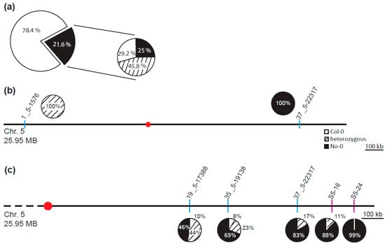 To identify the mutant locus genetically responsible for the fif phenotype, we combined a classical mapping [,,] with a mapping-by-sequencing approach [,]. To establish a mapping population, fif mutant plants (No-0) were crossed in both direction with plants of the Col-0 accession. Irrespective of the crossing direction, all the F1 plant displayed a wild type phenotype. Eight F1 plants were self-fertilized and 1582 F2 plants characterized phenotypically. In accordance with the self-crossing results described above, around 25% of the F2 plants (437 of the 1582) showed the fif phenotype. Leaf material was harvested from 425 of the 437 F2 plants in groups of 15 to 20 individuals; in addition, leaf material from 200 F2 plants was collected individually. Genomic DNA was extracted and used for classical mapping. Using chromosome-specific INsertion and DELetion (INDEL) markers [] the mutant locus was mapped to the q-arm of chromosome 5 (Figure 3b). Two additional INDEL markers and two single nucleotide polymorphism (SNP)-based derived cleaved amplified polymorphic sequences (dCAP) markers [,] limited the quantitative trait locus (QTL) responsible for the fif phenotype to the terminal end of chromosome 5’s q-arm (Figure 3c, dCAP S5-24: 99% No-0).