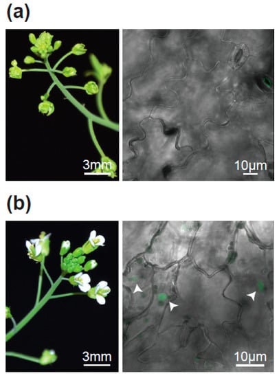 - Clough, S.J.; Bent, A.F. Floral dip: A simplified method for Agrobacterium-mediated transformation of Arabidopsis thaliana. Plant J. 1998, 16, 735–743. [Google Scholar] [CrossRef]
