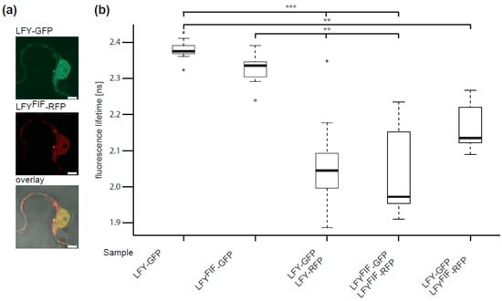 Next, we tested by in vivo FRET-FLIM whether LFY protein–protein interaction, here especially LFY homomerization [], was altered. To do so, C-terminal GFP fusions (FRET donors) and C-terminal RFP fusions (FRET acceptors) were transiently expressed, either individually (donor only) or in combination in N. benthamiana epidermal leaf cells and the fluorescence lifetime of the donor fusion was measured. As shown in Figure 6b, the fluorescence lifetimes of LFY-GFP and LFYFIF-GFP were similar in the absence of the acceptor fusions. However, the lifetimes of LFY-GFP and LFYFIF-GFP decreased significantly when they were co-expressed with either LFY-RFP or LFYFIF-RFP demonstrating homotypic (LFY-LFY, LFYFIF-LFYFIF) and heterotypic (LFY-LFYFIF) homomerization in planta (Figure 6b). There was no significant difference in the interaction properties of the homotypic and heterotypic homomers (Figure 6b).