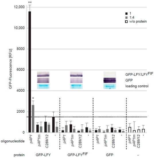 Comparative analysis of the in vitro DNA-binding capacity of LFY and LFYFIF using a GFP-fluorescence-based DPI-ELISA approach. GFP-LFY, GFP-LFYFIF and GFP were expressed in E. coli. After extraction, crude extracts containing either no recombinant protein (w/o protein) or, based on GFP fluorescence, equal amounts of GFP or the GFP fusion proteins were added to ELISA plates covered with either the double-stranded (ds) DNA oligonucleotide pAP1, which contains a LFY binding site, an altered version of pAP1 (pAP1m), in which the binding site was mutated, a dsDNA oligonucleotide unrelated to the pAP1 and pAP1m sequences (C28M12) or without any DNA-oligonucleotide. The amount of DNA-bound fusion protein was detected by reading out the GFP fluorescence. The crude extract was either used undiluted (black bars) or in a 1:4 dilution (grey bars). Error bars indicate the standard deviation of the mean (n = 3) and asterisk statistically significant differences to the background fluorescence (dotted horizontal line), determined by two-sided t-test (*: p < 0.05; **: p < 0.01). The inlet shows a Western-blot of the crude extracts using a GFP polyclonal antiserum for detection of GFP, GFP-LFY and GFP-LFYFIF as well as a Coomassie stain as loading control.