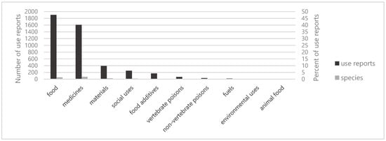 Our fieldwork generated 4443 use reports for the 83 legume species mentioned by ninety informants, including six specialists and 84 nonspecialists, from the three Karen communities in Thailand (Table 2). Khuntae had the highest total number of use reports (1609, 36%), followed by Pakanok (1469, 33%) and Tuan (1365, 31%) (Table 1). The uses of the legumes belonged to ten use categories in the system of Cook (1995) [23]. Food (1901 use reports; 43%), medicine (1608 use reports; 36%), and materials (390 use reports; 8%) were the three most important use categories (Figure 1).