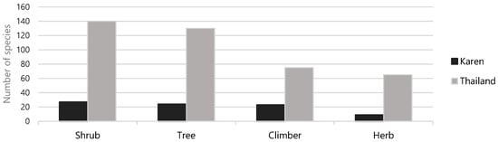 Legume species may comprise various life forms. Among the legumes used in the three Karen villages, shrubs were the most common life form, followed by trees, climbers, and herbs, which corresponds to the proportion of the same life forms in the Thai legume flora (Figure 2).