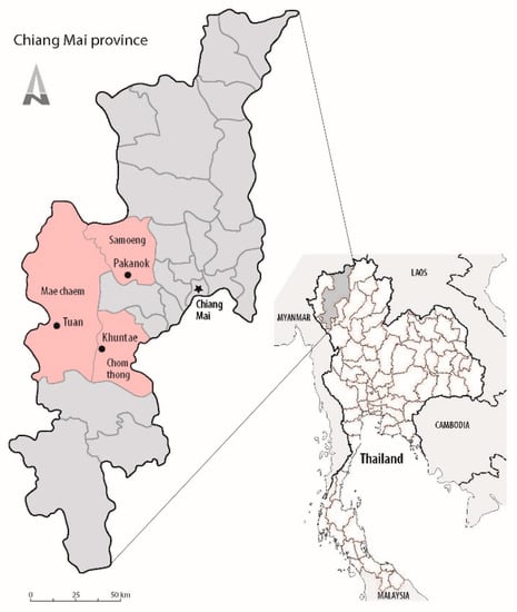 The field work was done in three Karen villages in Chiang Mai province, northern Thailand (Figure 3), in districts with high Karen populations: Tuan in Mae Chaem district, Pakanok in Samoeng district, and Khuntae in Chom Thong district. Their distances from the nearest urban centers range 15–26 km, and they are located at elevations ranging 863–1265 m above sea level (Table 1). All three study villages are surrounded by natural vegetation of mixed deciduous and dry evergreen forests. Most of their villagers practice agriculture, planting upland rice and some vegetables, and they raise livestock for consumption and sale. All villages have electricity and public upland water resources.