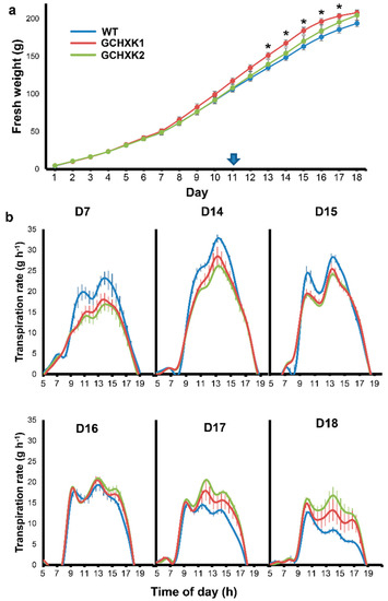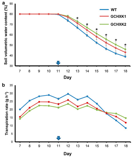 Despite their similar weights, the diurnal transpiration of the two GCHXK lines under normal irrigation conditions was less than that of the WT plants, primarily in the middle of the day, as exemplified on Day 7 (D7) in Figure 2b. Irrigation was stopped on Day 11, yet the transpiration of the WT plants remained higher than that of the GCHXK plants for four more days, until Day 15 (Figure 2b). The transpiration of WT plants was similar to that of the GCHXK plants on Day 16 and fell below that of the GCHXK plants on Days 17 and 18.