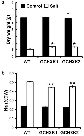 GCHXK plants under salt stress in the growth chamber. Three-week-old WT and GCHXK plants grown in a growth chamber were watered with 200 mM NaCl. We monitored their growth and Na contents for 1 month. (a) Dry weights of WT, GCHXK1 and GCHXK2 plants (n ≥ 8) at the end of the experiment, under control (black) and saline (white) conditions. (b) Sodium concentrations in the shoots of WT, GCHXK1 and GCHXK2 plants at the end of the experiment, under control (black) and saline (white) conditions. Four samples were taken for each line; each sample was composed of 3–4 shoots. Data given as means (±SE). Asterisks denote significant differences relative to the WT (t-test, * p < 0.05; ** p < 0.01).