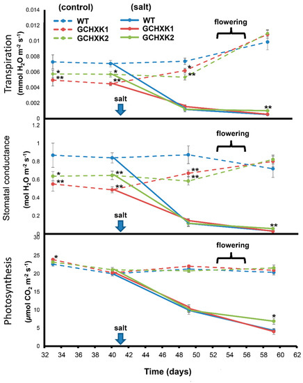Gas-exchange parameters of GCHXK plants under salt stress. GCHXK and WT plants were planted in perlite (an inert growth substance) and allowed to become established and grow for 41 days. At the end of that period of time, we started irrigating half of the plants with 150 mM NaCl and continued to irrigate the other half of the plants with regular water. During this experiment, we measured transpiration, stomatal conductance and photosynthesis. Data given as means (± SE), n ≥ 8. Asterisks denote significant differences relative to the WT (t-test, * p < 0.05; ** p < 0.01).