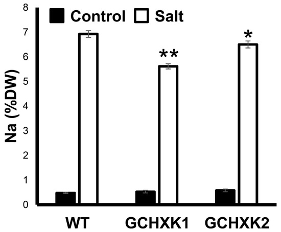 GCHXK plants under salt stress accumulates significantly less Na than WT plants. Na contents of GCHXK and WT plants under saline (white) and control (black) conditions. Data given as means ± SE, n = 9. Asterisks denote significant differences relative to the WT (t-test, * p < 0.05; ** p < 0.01).