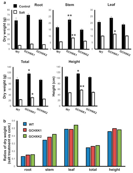 Biomass accumulation of GCHXK plants under saline conditions. GCHXK and WT plants were planted in perlite (an inert growth substance) and allowed to become established and grow for about 90 days. At the end of that period, we started irrigating half of the plants with 150 mM NaCl and continued to irrigate the other half of the plants with regular water. After 20 days of salt treatment, the plants were harvested for dry-weight measurements, n = 9. (a) Roots, stems, leaves and whole-plant dry weights of control and salt-treated plants and heights of control and salt-treated plants. (b) Ratios between the root, stem, leaf and total dry weights and heights of the salt-treated relative to the control plants. Data given as means (± SE). Asterisks denote significant differences relative to the WT (t-test, * p < 0.05; ** p < 0.01).