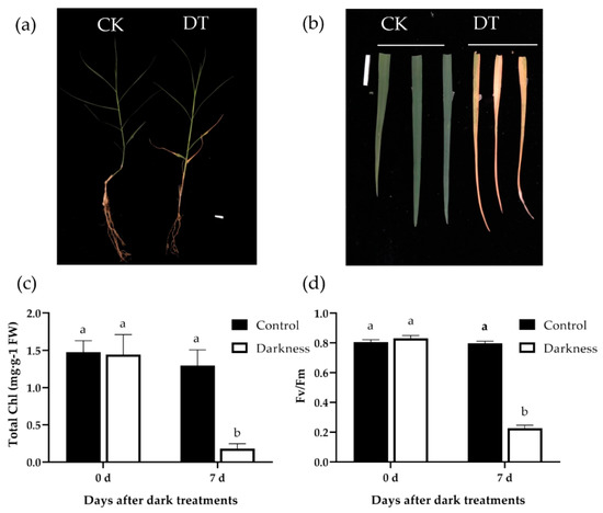Phenotype analysis of bermudagrass after dark treatment. (a) Phenotype of whole plants after 7 d of control (left: CK) and dark (right: DT) treatments (scale = 1 cm); (b) phenotype of bottom leaves after 7 d of control (left: CK) and dark (right: DT) treatments (scale = 1 cm); (c,d) total chlorophyll contents (c) and Fv/Fm (d) of the first and second leaves from bermudagrass under control and dark treatments. Significant (p < 0.05) differences are indicated by different letters using Tukey’s HSD test. Error bars indicate the SD of three biological repeats. Fw—fresh weight.