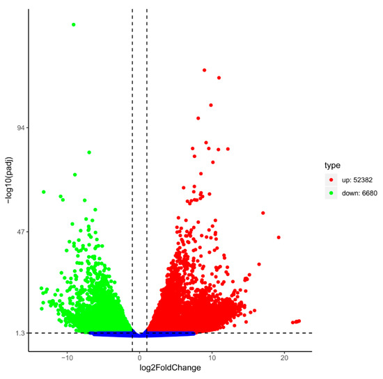 To investigate the global gene expressions in response to dark-induced leaf senescence, the differentially expressed genes between the control and dark-treated samples were analyzed. According to the criteria that at least a two-fold difference and an adjusted p-value less than 0.05 (|log2 (DT/CK)| ≥ 1, padj ≤ 0.05), a total of 59,062 genes, including 52,382 up-regulated genes and 6680 down-regulated genes, were found to be differentially expressed between CK and DT (Figure 2). It should be noted that the number of up-regulated genes was much larger than that of down-regulated genes, indicating that most of the genes were induced after dark treatment.