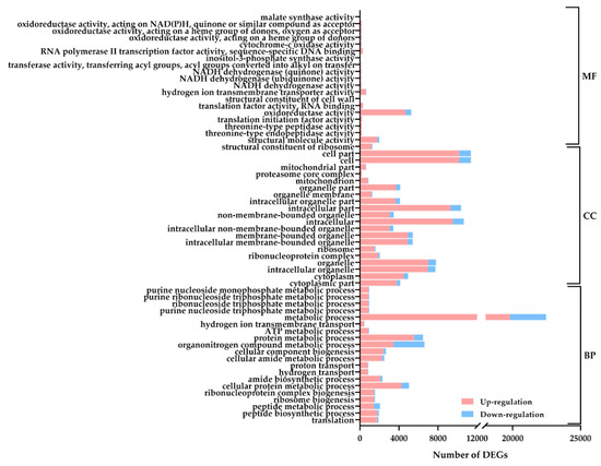 Gene Ontology (GO) classification of DEGs between CK and DT. DEGs were annotated in three categories: biological process (BP), cellular component (CC), and molecular function (MF). The enrichment index of each ontology term increased from the bottom up along Y-axis in all three categories.