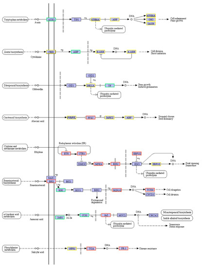 Differentially expressed genes between CK and DT in plant hormone signal transduction pathway. The red frame represents up-regulated genes, green frame represents down-regulated genes, and the yellow frame represents both up-regulated and down-regulated genes.