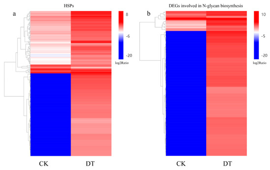 Hierarchical clustering analysis of DEGs between CK and DT. (a) Heat shock proteins (Hsps) were largely and significantly induced by dark-induced leaf senescence; (b) Almost all DEGs involved in N-glycan biosynthesis were activated during dark-induced leaf senescence. Different color bands represent the different expression level of each sample. The red bands represent a high expression level and the blue bands represent low expression levels.