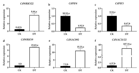 Real-Time RT-PCR (qRT-PCR) validation of DEGs in response to dark-induced leaf senescence. Expression analysis of (a) CdWRKY22; (b) CdPIF4; (c) CdPIF3; (d) CdWRKY9; (e) CdNAC092; (f) CdNAC21/22 between CK and DT by qRT-PCR. The numbers above the error bars represent the fragments per kilobase of transcript per million fragments mapped (FPKM) obtained by RNA-sequence in CK and DT. Letters above error bars indicate a significant difference (p < 0.05) between CK and DT using Student’s t-test. The error bars represent the SD value (n = 3).