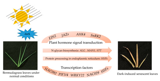 In this study, RNA sequencing was performed in CK and DT of bermudagrass. Our results suggested that dark responsive genes were mainly involved in plant hormone signal transduction, N-glycan biosynthesis, and protein processing in the endoplasmic reticulum. In addition, NAC, WRKY, bHLH, and HSF TF families were also responsive to dark-induced leaf senescence in bermudagrass.