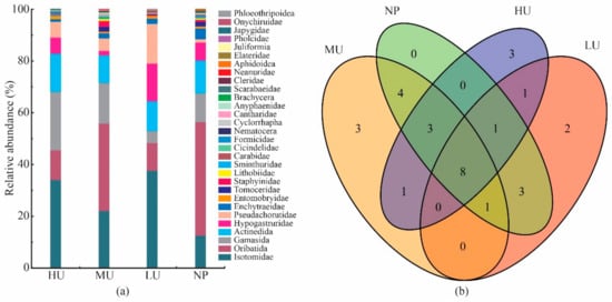 Venn diagrams showing the unique and shared taxa are detailed in Figure 1b. The four treatments had eight taxa (Isotomidae, Oribatida, Gamasida, Actinedida, Hypogastruridae, Pseudachorutidae, Enchytraeidae, and Entomobryidae) in common, which in combination contributed to between 40% and 50% of the full set of taxa in each treatment. In the HU treatment, Formicidae, Juliformia, and Japygidae were the unique taxa. Cicindelidae, Aphidoidae, and Pholcidae were recognized only in the MU treatment. Onychiruidae and Phloeothripoidae were found only in the LU treatment. In contrast, no unique taxa were collected in the native plant habitats (NP).