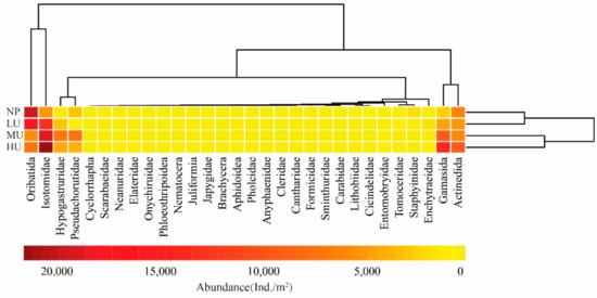 Abundance heatmap of log (x + 1) normalized soil mesofauna in the different treatments. A dendrogram of sample sites based on similarity is along the right axis, and a dendrogram of soil arthropod taxa based on similarity is along the upper axis. The colors represent abundance of soil mesofauna. HU: high level of D. purpurea upward expansion; MU: medium level of D. purpurea upward expansion; LU: low level of D. purpurea upward expansion; NP: native plant habitats.