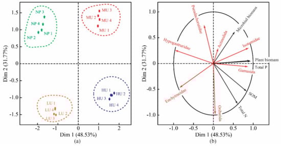 Two-dimensional diagram of multiple factor analysis (MFA). (a) Two-dimensional scatter diagram of the MFA performed for the different sampling sites in the alpine tundra of the Changbai Mountains. HU: high level of D. purpurea upward expansion; MU: medium level of D. purpurea upward expansion; LU: low level of D. purpurea upward expansion; NP: native plant habitats. (b) Two-dimensional ordination plot of the MFA performed for the entire data set, including environment factors and soil mesofauna data. The percentages appearing next to the axis numbers are the total variation of the data explained by that axis.
