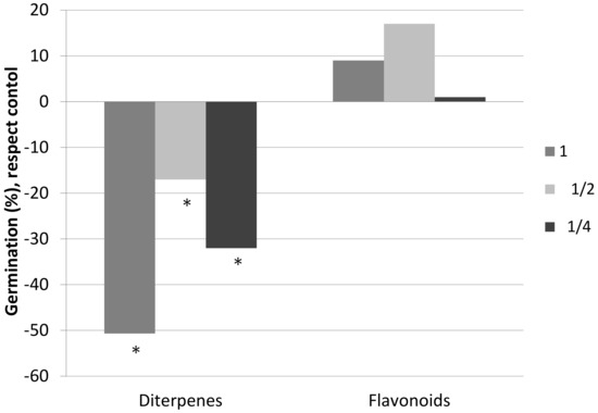 Germination percentage, with respect to the control sample, of the seeds of C. ladanifer watered with a solution of diterpenes and a solution of flavonoids at three different concentrations (6 replicates per treatment): 1 (0.26 g/L), ½ (0.13 g/L), and ¼ (0.065 g/L). * Significant difference with respect to the control sample (M-W; p < 0.05).