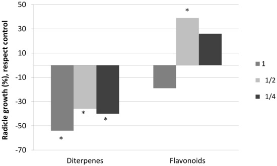 Radicle growth, with respect to the control, of the seedlings of C. ladanifer watered with solutions of diterpenes and solutions of flavonoids at three different concentrations: 1 (0.26 g/L), ½ (0.13 g/L), and ¼ (0.065 g/L). * Significant difference with respect to the control (M-W; p < 0.05).