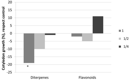 Cotyledon growth, with respect to the control, of the seedlings of C. ladanifer watered with solutions of diterpenes and solutions of flavonoids at three different concentrations: 1 (0.26 g/L), ½ (0.13 g/L), and ¼ (0.065 g/L). * Significant difference with respect to the control (M-W; p < 0.05).