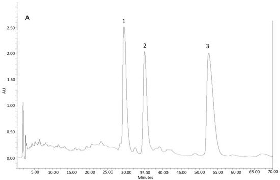The fractions gathered in each tube were analysed in a high-performance liquid chromatograph, HPLC (Waters Corporation, Milford, CT, USA: Pumps: 515 HPLC Pump; Injector: 717plus Autosampler; Detector: 996 Photodiode Array Detector) with a C-18 analytic column (10 × 250 mm) and using water/methanol/tetrahydrofuran (56:16:28) as a solvent at 0.75 mL/min. Twenty microliters of sample were injected. The chromatograms were set at a maximum length of 350 nm to detect the presence of flavonoids, and 250 nm for diterpenes [11,19]. The compounds were identified from the retention times and spectral characteristics [11,19].