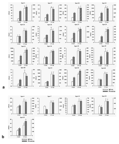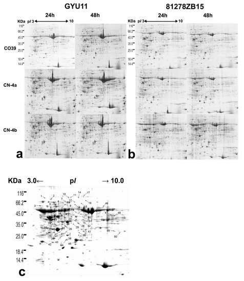 4.2. Two-Dimensional Electrophoresis (2-DE) and Spots Selection