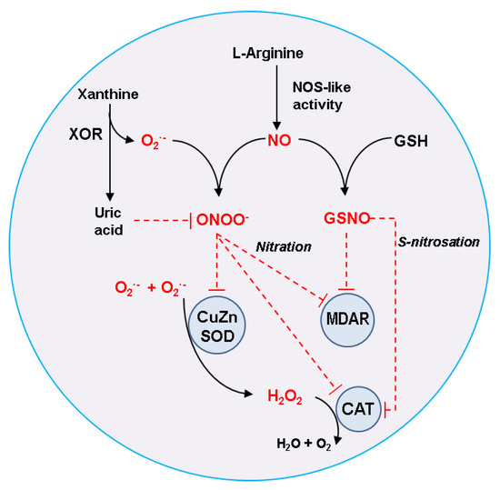 Plant peroxisomes have relevant antioxidant systems comprised mainly of CAT, SOD, and the ASC-GSH cycle, which are present in all types of plant peroxisomes [7]. Likewise, results obtained in previous research works have demonstrated that besides an active ROS metabolism in peroxisomes, these organelles also have an active RNS metabolism. Although there are few specific studies on how distinct RNS can regulate the different peroxisomal antioxidant systems, the data available suggest the NO may act upstream of the H2O2 metabolism. A scheme based on previous reports [7,11,83,84], showing how NO can modulate the activity of peroxisomal antioxidant enzymes throughout either nitration or S-nitrosation, is presented in Figure 1. The peroxisomal xanthine oxidoreductase (XOR) activity catalyzes the oxidation of xanthine with the production of uric acid and O2·− [85]. On the other hand, L-arginine-dependent NOS-like activity generates NO, which can react with O2·− to produce ONOO−, a powerful oxidant and strong nitrating molecule that can mediate PTMs through tyrosine nitration [86]. NO can also interact with reduced glutathione (GSH) to form GSNO, a NO donor that can mediate S-nitrosation of proteins [87]. Uric acid is a recognized inhibitor of ONOO−-mediated toxicity [88,89], and this brings out a new potential mechanism of peroxisomal auto-regulation through this powerful nitrating molecule. In this scenario, the identified targets of NO-derived PTMs in peroxisomes, CAT, CuZnSOD, and MDAR, which are either directly or indirectly linked to the H2O2 pool, are key points to be modulated by nitration or S-nitrosation.
