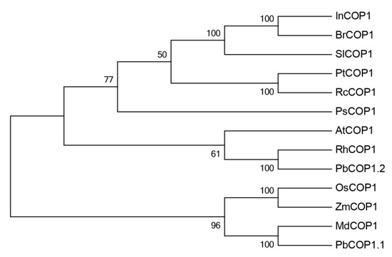Phylogenetic tree of COP1 from different species. In, Ipomoea tricolor (AAG31173.1); Br, Brassica capitata (AAN86553.1); Sl, Solanum lycopersicum(AAC98912.1); Pt, Populustrichocarpa (XP_002321154.1); Rc, Ricinus communis (XP_002534127.1); Ps, Pisum sativum (CAB94800.1); At, Arabidopsis thaliana (AEC08766.1); Rh, Rosa spp. hybrid cultivar (AAK81856.1); Pb, Pyrus bretschneideri (XP_009357519.2, XP_009340196.1); Os, Oryza sativa subsp. indica (BAA94422.1); Zm, Zea mays (ACG47820.1); Md, Malus × domestica (AB668570.1).