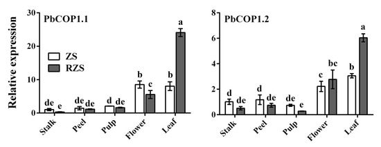 Expression patterns of PbCOP1.1 and PbCOP1.2 in different pear tissues. ZS, ‘Zaosu’, RZS, ‘Red Zaosu’. All data are presented as the means ± standard errors (SE) of three biological replicates, and different letters above the columns indicate significant differences at P < 0.05 (Duncan’s range test).
