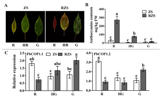 Phenotypes, anthocyanin contents and expression levels of PbCOP1 genes at different leaf developmental stages. (A) Leaf phenotypes. (B) Anthocyanin contents in leaves. (C) PbCOP1 expression levels in leaves. R, red; HR, half red; G, green. ZS, ‘Zaosu’; RZS, ‘Red Zaosu’. All data are presented as the means ± standard errors of three biological replicates, and different letters above the columns indicate significant differences at P < 0.05 (Duncan’s range test).