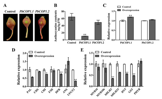To verify PbCOP1 functions in pear fruit coloration, their expression levels were enhanced in transient overexpression assays. The overexpression of both PbCOP1.1 and PbCOP1.2 inhibited fruit coloration around the injection sites in ‘Red Bartlett”. The expression level of PbCOP1.1 was significantly enhanced in its overexpressing fruit compared with in the empty vector, while that of PbCOP1.2 was also enhanced in its overexpressing fruit, but not significantly. Compared with the control, the anthocyanin contents were reduced significantly in the peel of fruit overexpressing PbCOP1.1, while no significant difference was observed in the anthocyanin contents of fruit overexpressing PbCOP1.2 (Figure 5A–C). Therefore, the expression levels of anthocyanin-related synthetic genes were assessed by real-time PCR using PbCOP1.1 overexpressing peel.