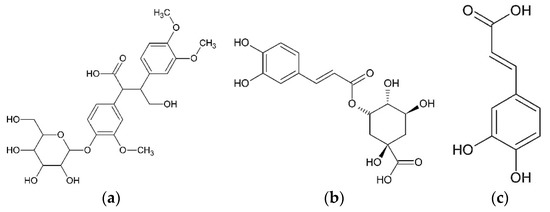 Phenylpropanoids from O. acanthium L.: (a) Aconiside; (b) Isochlorogenic acid; (c) Caffeic acid.