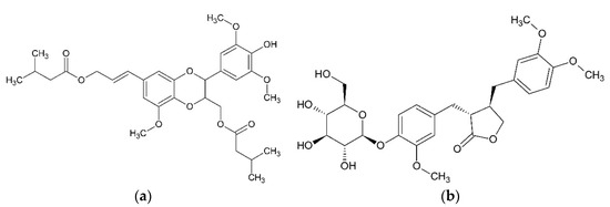 Lignans from O. acanthium L.: (a) Nitidanin diisovalerianate; (b) Arctiin.