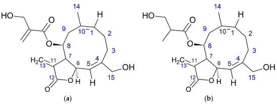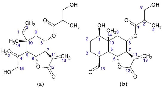 Elemanolide and eudesmanolide from O. acanthium L.: (a) Elemanolide 11(13)-dehydromelitensin β-hydroxyisobutyrate; (b) Acanthiolide.