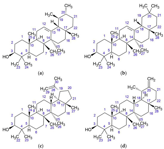 Triterpenoids from O. acanthium L.: (a) α-amyrin; (b) β-amyrin; (c) Lupeol; (d) Taraxasterol.