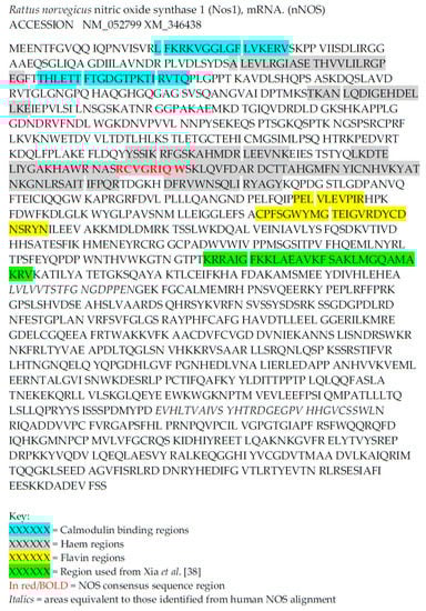 However, it cannot be assumed that all elements of a mammalian NOS should be identifiable. OtNOS lacks the autoregulatory control element, suggesting that it is most closely related to the iNOS isoform in mammals []. This may also suggest that looking for a similar domain in a higher plant NOS is futile. Here, as an example of the sorts of aspects that could be looked for, a bioinformatics approach was used. This way of searching for a NOS-like enzyme is predicated on the fact that there should be domains or motifs which are important for NOS-like function, and therefore there should be some level of conservation in these sequences, albeit perhaps hard to find. The mammalian enzymes contain an oxidase domain, a reductase domain and regions which are able to interact with calmodulin []. Here, small stretches of sequence have been used to search for possible NOS-like candidates in Arabidopsis and Oryza (Table 1). These relatively short sequences have been derived from the work of others [,], such as those looking for NOS-interactions in rat NOS, as well as using the Prosite [] NOS signature and sequences identified from alignments of the three human NOS proteins using ClustalOmega [] (data not shown). The relative positions of such sequences within the rat nNOS peptide sequence is shown in Figure 1.